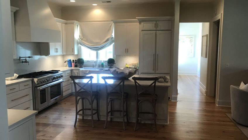 The sparse dated ranch kitchen was completely gutted and the wall separating the kitchen and living room was taken down and replaced with an in-ceiling beam to open up the entire space. The L-shaped island was installed and transformed the space into a functioning professional-grade kitchen. Part of the existing utility room was converted into a carport entrance mudroom and pantry area.